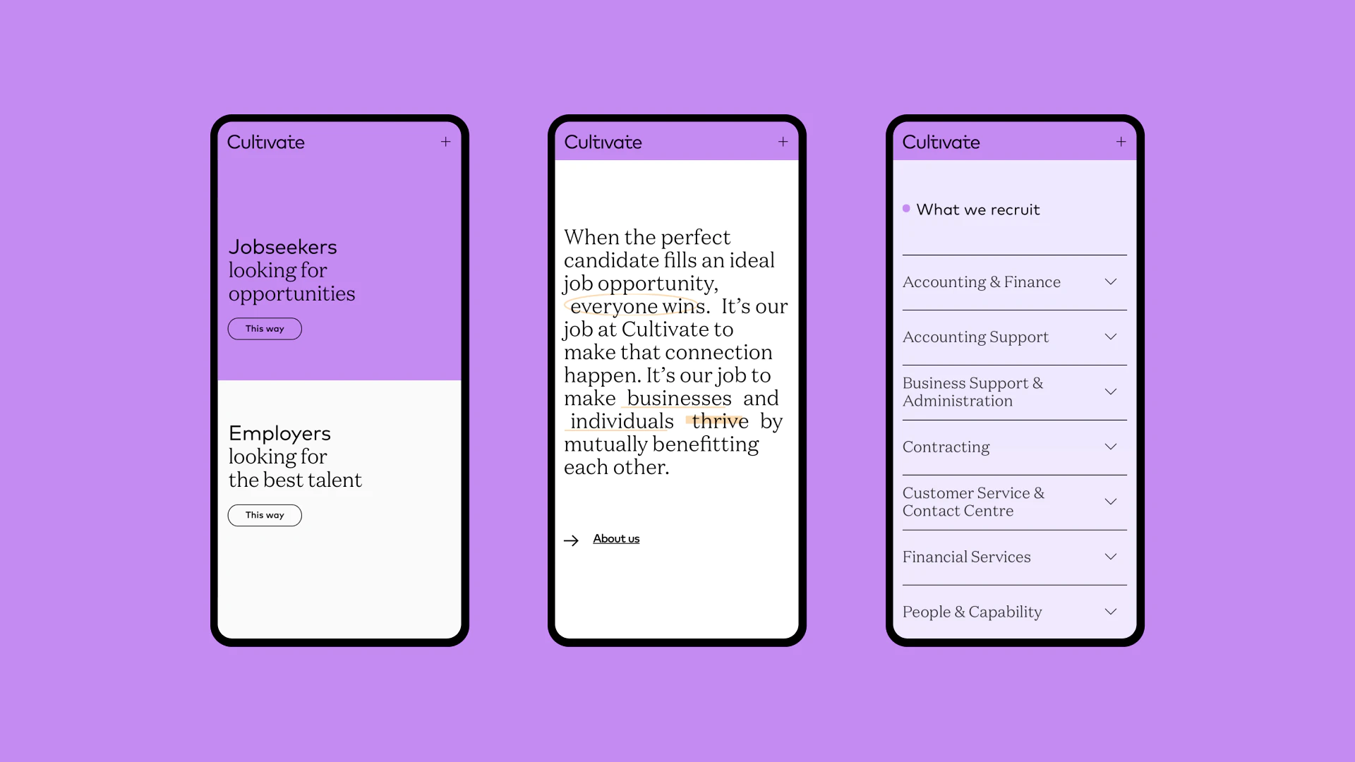 Extraordinary things happen when opportunity and potential connect, and our job was to build a digital platform for new recruitment firm Cultivate to facilitate that connection between their clients and job applicants. The Cultivate website is fully API-integrated with the company's recruitment software, making it a core vital component of the company by automating much of the manual heavy lifting for its team.